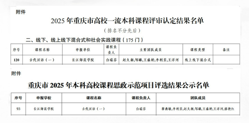 12月24日,重庆市教育委员会公布了2025年重庆市高校一流本科课程评审认定结果名单,人文学院《古代汉语(一...