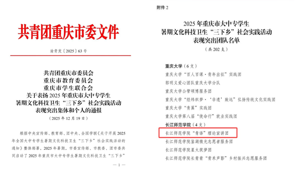 12月19日,共青团重庆市委员会、重庆市教育委员会、重庆市学生联合会联合印发《关于表扬2025年重庆市大中专...