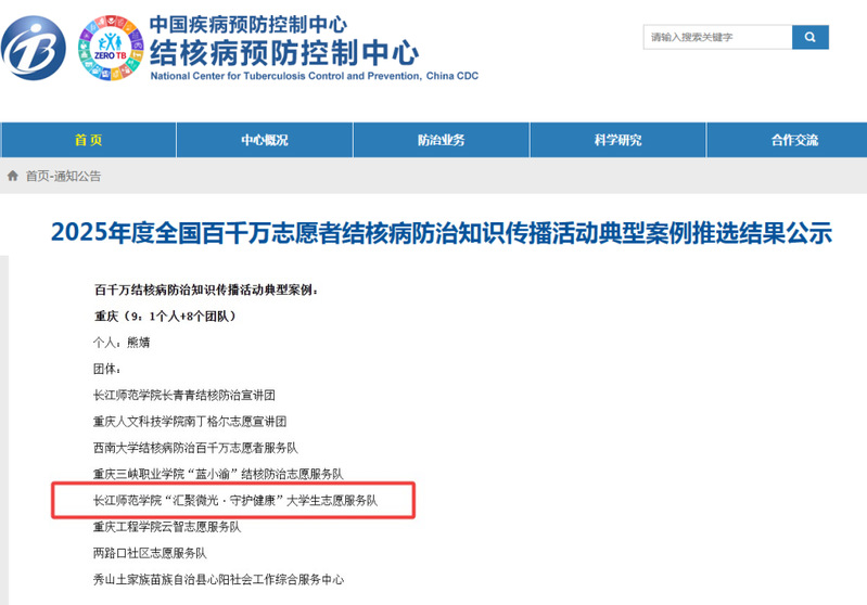 3月14日,中国疾控中心结核病预防控制中心公布了2025年度全国百千万志愿者结核病防治知识传播活动典型案例推选结果,人文学院“汇聚微光·守护健康”大学生志愿服务队被推选为全国典型案例团队。