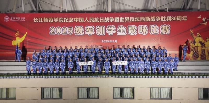 为纪念中国人民抗日战争暨世界反法西斯战争胜利80周年,引导2025级新生坚定理想信念,增强爱校荣校意识。9月24日晚,长江师范学院在行健体育场举行2025级军训学生歌咏比赛。人文学院代表队精神饱满、意气风发,用最铿锵的旋律唱响新时代的使命担当,用执着的信念奏响青春的奋进乐章。