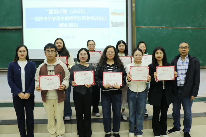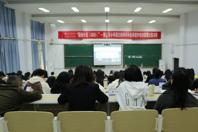 10月31日,国培计划(2025)重庆市小学语文骨干教师学科素养提升培训班在诚意楼02阶梯教室举办微课比赛决赛暨结业典礼。重庆市涪陵区教师发展中心副主任叶洪林老师、垫江县桂溪小学陈芝理老师、合川区久长街小学陈曦老师、渝中区枇杷山小学陈杰老师、巴南区箭滩河小学万刘湘老师担任决赛评委。人文学院院长彭福荣,国培计划(2025)项目负责人张红兵,培训班班主任马亚菊及全体参训学员参加,2024级汉语言文学(师范)专业学生到场观摩学习。