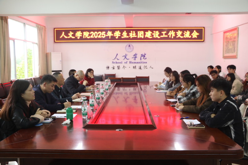 11月7日,人文学院在钩深楼南楼414会议室召开2025年学生社团建设工作交流会。学院党委书记邓清华,党委副书记、副院长王晓晖,团委书记、学工办主任王勇,学生社团指导老师曾兴智、戴欣洋、罗燕及社团负责人参加。会议由王晓晖主持。