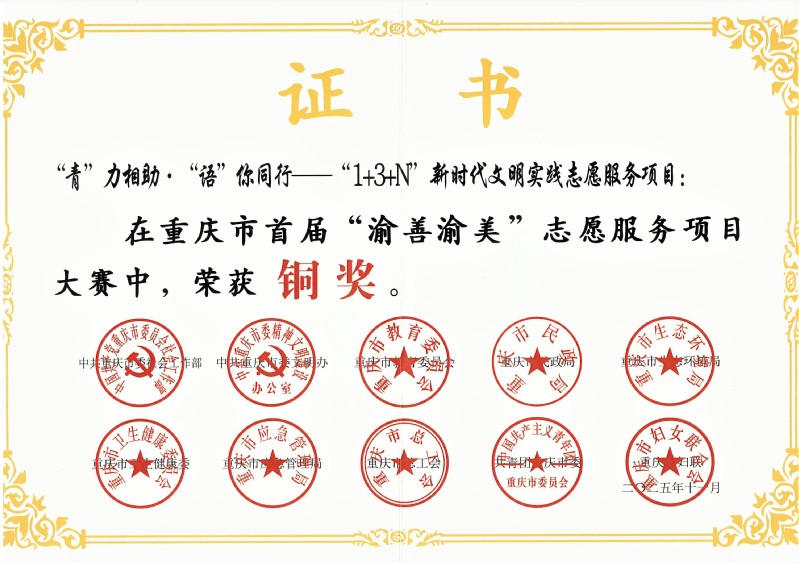 12月1日,中共重庆市委社会工作部等部门印发《关于公布重庆市首届“渝善渝美”志愿服务项目大赛优秀项目名单的通报》,人文学院申报的《“青”力相助·“语”你同行——“1+3+N”新时代文明实践志愿服务项目》荣获铜奖。