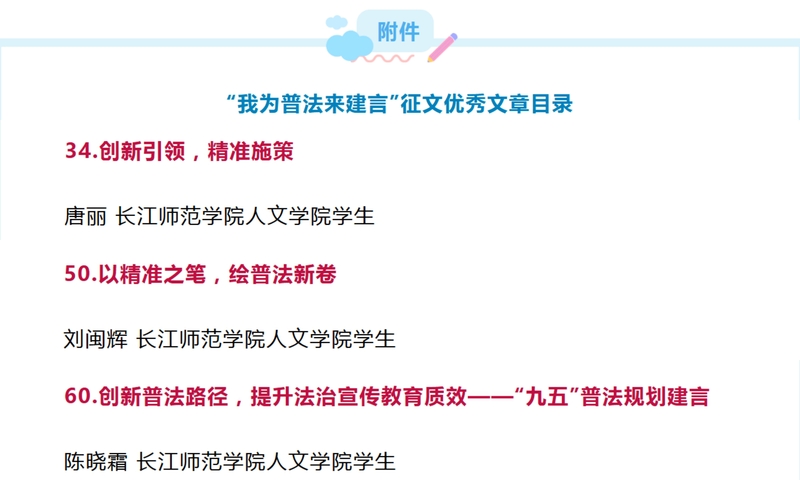 近日,由司法部普法与依法治理局、中国法治杂志社联合开展的“我为普法来建言”征文活动公布了评选结果。人文学院唐丽同学、刘闽辉同学、陈晓霜同学提交的征文作品脱颖而出,获评优秀文章。