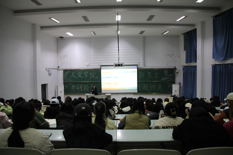 为进一步帮助在校学生全面掌握硕士研究生招生考试的基本政策,明晰报考流程及要求,合理确定考研方向。12月17日晚,人文学院在正心楼01阶梯教室举办新东方考研指导专题讲座,特邀新东方教育科技集团资深考研英语讲师汤海洋担任主讲人,学院各年级有考研意向的同学积极参与。