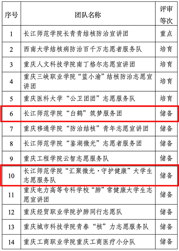 为深入贯彻落实《重庆市结核病防治行动方案(2024—2035年)》要求,深入实施“百千万志愿者结核病防治知识传播活动提升行动”,持续在高校开展志愿者结核病防治知识传播行动,通过高校申报、专家评审,共30支大学生志愿服务团队获得立项资格,主办单位将对所有立项团队给予经费支持。2026年,人文学院“白鹤”筑梦服务团、“汇聚微光·守护健康”大学生志愿服务队将以“世界防治结核病日”为契机,深入街道社区、青少年之家、新时代文明实践中心、班级社团等地,采取主题宣讲、专题讲座、知识竞赛等形式开展结核病防治知识宣传活动,积极倡导文明健康的生活方式,有效促进结核病早发现、早诊断、早治疗,营造全社会共同防治结核病的良好氛围。