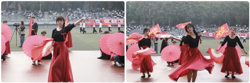 开幕式上,人文学院师生步伐整齐、精神抖擞、气宇轩昂,奋力喊出“扩硕升博、更名升大”的响亮口号。开幕式展演中,学院别出心裁、推陈出新,将传统伞艺与古典舞蹈巧妙融合,同学们手持彩扇、翩翩起舞,瞬间“点燃”全场气氛,赢得师生阵阵喝彩。经过网络评选,学院方队获“最佳人气方队”称号。